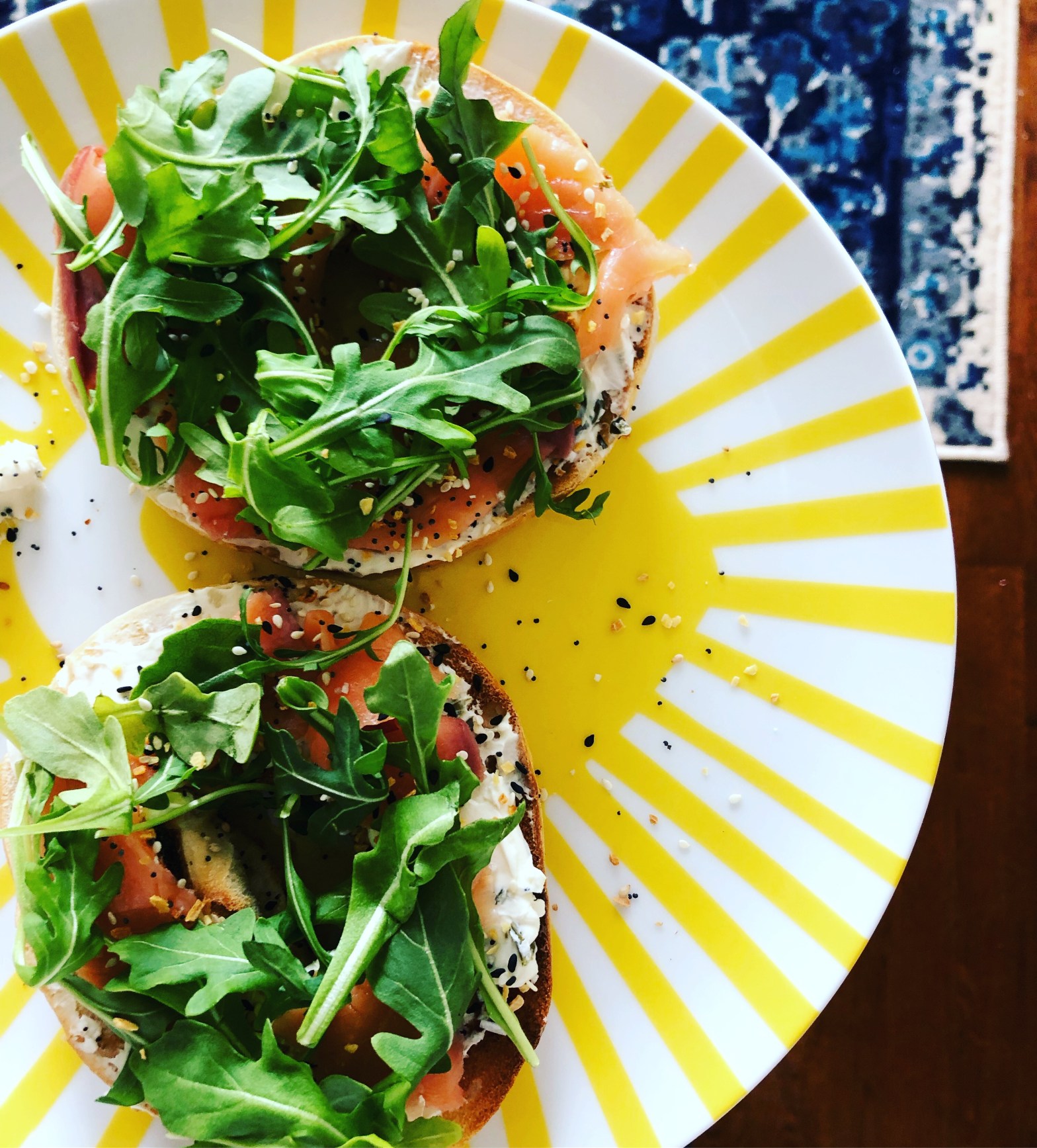 - Layer Smoked Salmon (lox) onto the bagel, and top with arugula