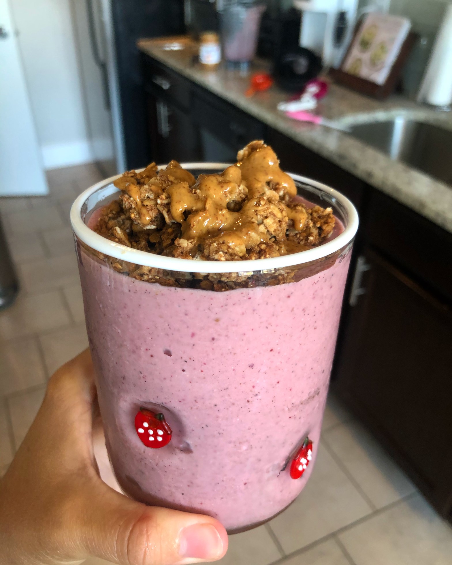 2. Add smoothie to a glass, and top with granola and nut butter!